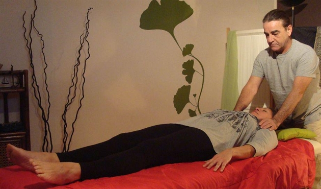 Le praticien réalise une série d'impositions des mains sur le corps du client.